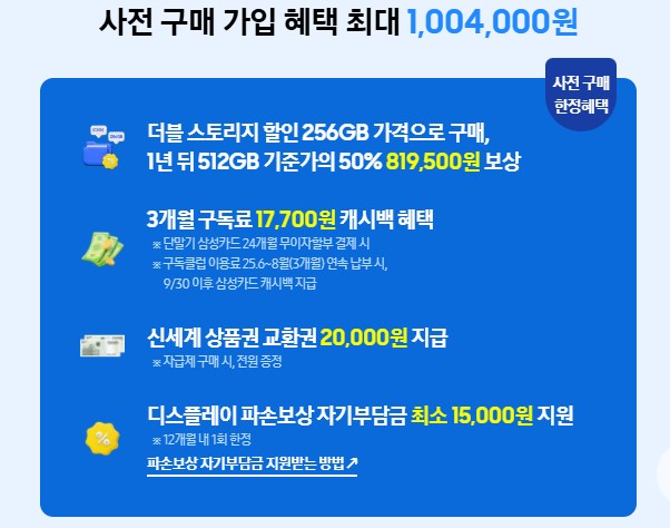 사전 구매자에게 더블 스토리지 혜택 (256GB→ 512GB) 함께 삼성케어플러스 스마트폰 파손+, 모바일 액세서리 할인 쿠폰 등을 제공